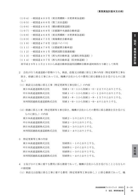 (業務実施計画本文の例)(104)一般国道409号(東京湾横断・木更津東金道路)(105)一般国道466号(第三京浜道路)(106)一般国道468号(横浜横須賀道路)(107)一般国道468号(首都圏中央連絡自動車道)(108)一般国道468号(東京湾横断・木更津東金道路)(109)一般国道475号(東海環状自動車道)(110)一般国道478号(京滋バイパス)(111)一般国道478号(京都縦貫自動車道)(112)一般国道481号(関西国際空港連絡橋)(113)一般国道497号(西九州自動車道(武雄佐世保道路))(114)一般国道497号(西九州自動車道(佐世保道路))※平成29年11月21日から高速自動車国道四国横断自動車道阿南四万十線として供用2会社が行う高速道路の管理のうち、新設、改築又は修繕に係る工事の内容(特定更新等工事を除き、修繕に係る工事にあっては、機構が会社からその費用に係る債務を引き受けるものに限る。)(1)新設又は改築に係る工事(特定更新等工事を除く。)の内容東日本高速道路株式会社別紙1-E-1から別紙1-E-227のとおりとする。中日本高速道路株式会社別紙1-C-1から別紙1-C-120のとおりとする。西日本高速道路株式会社別紙1-W-1から別紙1-W-157のとおりとする。本州四国連絡高速道路株式会社別紙1-H-1から別紙1-H-4のとおりとする。(2)修繕に係る工事(特定更新等工事を除き、機構が会社からその費用に係る債務を引き受けるものに限る。)の内容東日本高速道路株式会社別紙2-1のとおりとする。中日本高速道路株式会社別紙2-2のとおりとする。西日本高速道路株式会社別紙2-3のとおりとする。本州四国連絡高速道路株式会社別紙2-4のとおりとする。3特定更新等工事の内容東日本高速道路株式会社別紙特1-1のとおりとする。中日本高速道路株式会社別紙特1-2のとおりとする。西日本高速道路株式会社別紙特1-3のとおりとする。本州四国連絡高速道路株式会社別紙特1-4のとおりとする。42及び3の工事に要する費用に係る債務であって、機構が会社から引き受けることとなるものの限度額(1)新設又は改築に係る工事に要する費用(特定更新等工事を除く。)に係る債務であって、機Ⅱ協定、業務実施計画Ⅱ-3136