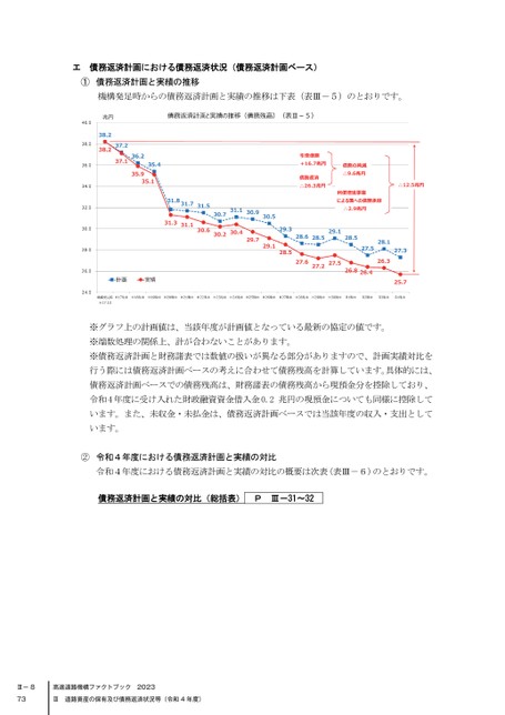 エ債務返済計画における債務返済状況(債務返済計画ベース)①債務返済計画と実績の推移機構発足時からの債務返済計画と実績の推移は下表(表Ⅲ-5)のとおりです。※グラフ上の計画値は、当該年度が計画値となっている最新の協定の値です。※端数処理の関係上、計が合わないことがあります。※債務返済計画と財務諸表では数値の扱いが異なる部分がありますので、計画実績対比を行う際には債務返済計画ベースの考えに合わせて債務残高を計算しています。具体的には、債務返済計画ベースでの債務残高は、財務諸表の債務残高から現預金分を控除しており、令和4年度に受け入れた財政融資資金借入金0.2兆円の現預金についても同様に控除しています。また、未収金・未払金は、債務返済計画ベースでは当該年度の収入・支出としています。②令和4年度における債務返済計画と実績の対比令和4年度における債務返済計画と実績の対比の概要は次表(表Ⅲ-6)のとおりです。債務返済計画と実績の対比(総括表)PⅢ-31~32Ⅲ-873Ⅲ道路資産の保有及び債務返済状況等(令和4年度)
