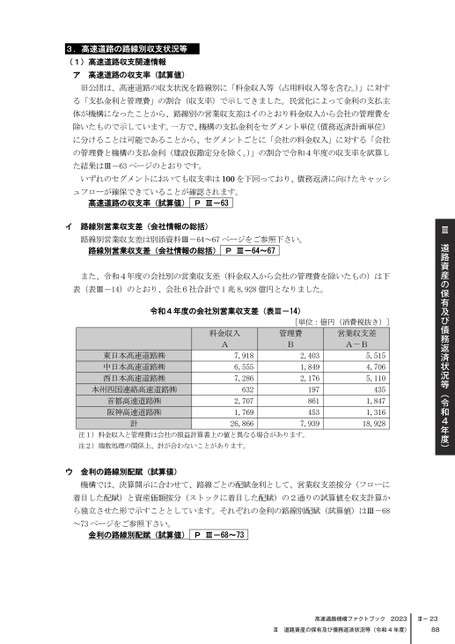 3.高速道路の路線別収支状況等(1)高速道路収支関連情報ア高速道路の収支率(試算値)旧公団は、高速道路の収支状況を路線別に「料金収入等(占用料収入等を含む。)」に対する「支払金利と管理費」の割合(収支率)で示してきました。民営化によって金利の支払主体が機構になったことから、路線別の営業収支差はイのとおり料金収入から会社の管理費を除いたもので示しています。一方で、機構の支払金利をセグメント単位(債務返済計画単位)に分けることは可能であることから、セグメントごとに「会社の料金収入」に対する「会社の管理費と機構の支払金利(建設仮勘定分を除く。)」の割合で令和4年度の収支率を試算した結果はⅢ-63ページのとおりです。いずれのセグメントにおいても収支率は100を下回っており、債務返済に向けたキャッシュフローが確保できていることが確認されます。高速道路の収支率(試算値)PⅢ-63イ路線別営業収支差(会社情報の総括)路線別営業収支差は別添資料Ⅲ-64~67ページをご参照下さい。路線別営業収支差(会社情報の総括)PⅢ-64~67また、令和4年度の会社別の営業収支差(料金収入から会社の管理費を除いたもの)は下表(表Ⅲ-14)のとおり、会社6社合計で1兆8,928億円となりました。令和4年度の会社別営業収支差(表Ⅲ-14)東日本高速道路㈱中日本高速道路㈱西日本高速道路㈱本州四国連絡高速道路㈱首都高速道路㈱阪神高速道路㈱計[単位:億円(消費税抜き)]料金収入A管理費B営業収支差A-B7,9186,5557,2866322,7071,76926,8662,4031,8492,1761978614535,5154,7065,1104351,8471,3167,93918,928注1)料金収入と管理費は会社の損益計算書上の値と異なる場合があります。注2)端数処理の関係上、計が合わないことがあります。ウ金利の路線別配賦(試算値)機構では、決算開示に合わせて、路線ごとの配賦金利として、営業収支差按分(フローに着目した配賦)と資産価額按分(ストックに着目した配賦)の2通りの試算値を収支計算から独立させた形で示すこととしています。それぞれの金利の路線別配賦(試算値)はⅢ-68~73ページをご参照下さい。金利の路線別配賦(試算値)PⅢ-68~73Ⅲ道路資産の保有及び債務返済状況等(令和4年度)Ⅲ-2388