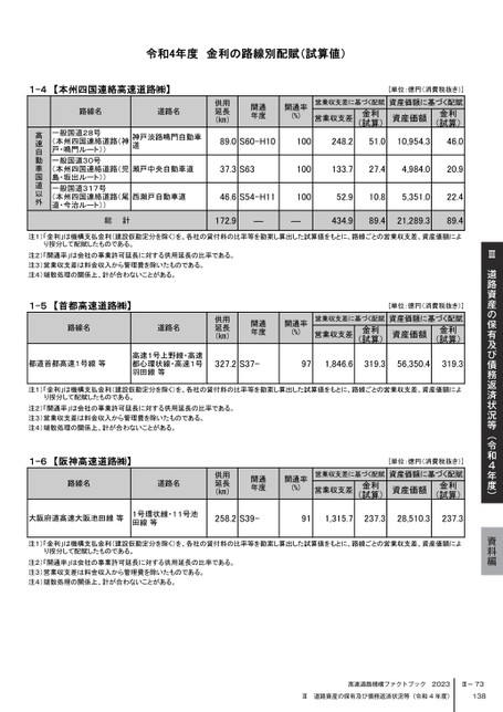 令和4年度金利の路線別配賦(試算値)様式16[単位:億円(消費税抜き)]1-4【本州四国連絡高速道路㈱】路線名道路名供用延長(㎞)開通年度開通率(%)営業収支差に基づく配賦資産価額に基づく配賦営業収支差金利(試算)資産価額金利(試算)Ⅲ道路資産の保有及び債務返済状況等(令和4年度)Ⅲ-73138神戸淡路鳴門自動車道89.0S60-H10100248.251.010,954.346.0瀬戸中央自動車道37.3S63100133.727.44,984.020.9西瀬戸自動車道46.6S54-H1110052.910.85,351.022.4一般国道28号(本州四国連絡道路(神戸・鳴門ルート))一般国道30号(本州四国連絡道路(児島・坂出ルート))一般国道317号(本州四国連絡道路(尾道・今治ルート))高速自動車国道以外総計172.9――434.989.421,289.389.4注1)「金利」は機構支払金利(建設仮勘定分を除く)を、各社の貸付料の比率等を勘案し算出した試算値をもとに、路線ごとの営業収支差、資産価額により按分して配賦したものである。注2)「開通率」は会社の事業許可延長に対する供用延長の比率である。注3)営業収支差は料金収入から管理費を除いたものである。注4)端数処理の関係上、計が合わないことがある。1-5【首都高速道路㈱】路線名道路名供用延長(㎞)開通年度開通率(%)営業収支差に基づく配賦資産価額に基づく配賦営業収支差金利(試算)資産価額金利(試算)[単位:億円(消費税抜き)]都道首都高速1号線等高速1号上野線・高速都心環状線・高速1号羽田線等327.2S37-971,846.6319.356,350.4319.3注1)「金利」は機構支払金利(建設仮勘定分を除く)を、各社の貸付料の比率等を勘案し算出した試算値をもとに、路線ごとの営業収支差、資産価額により按分して配賦したものである。注2)「開通率」は会社の事業許可延長に対する供用延長の比率である。注3)営業収支差は料金収入から管理費を除いたものである。注4)端数処理の関係上、計が合わないことがある。1-6【阪神高速道路㈱】路線名道路名供用延長(㎞)開通年度開通率(%)営業収支差に基づく配賦資産価額に基づく配賦営業収支差金利(試算)資産価額金利(試算)[単位:億円(消費税抜き)]大阪府道高速大阪池田線等1号環状線・11号池田線等258.2S39-911,315.7237.328,510.3237.3注1)「金利」は機構支払金利(建設仮勘定分を除く)を、各社の貸付料の比率等を勘案し算出した試算値をもとに、路線ごとの営業収支差、資産価額により按分して配賦したものである。注2)「開通率」は会社の事業許可延長に対する供用延長の比率である。注3)営業収支差は料金収入から管理費を除いたものである。注4)端数処理の関係上、計が合わないことがある。