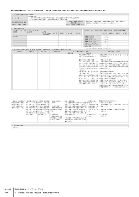 中期目標管理法人年度評価項目別評定調書(国民に対して提供するサービスその他業務の質の向上に関する事項)様式中期目標管理法人年度評価項目別評定調書(国民に対して提供するサービスその他業務の質の向上に関する事項)様式高速道路事業会社による管理の適正な水準の確保を通じた高速道路資産の適切な保有及び貸付け道路資産の内容を把握し、その保有及び貸付けを適切に実施会社による管理の適正な水準の確保を通じた高速道路資産の適切な保有及び貸付け1①①道路資産の内容を把握し、その保有及び貸付けを適切に実施当該事業実施に係る根拠(個別法条文など)当該事業実施に係る根拠関連する政策評価・行政事業レビュー(個別法条文など)関連する政策評価・行政事業レビュー独立行政法人高速道路保有・債務返済機構法第12条第1項第1号高速道路に係る道路資産を保有し、これを会社に貸し付けること。独立行政法人高速道路保有・債務返済機構法第12条第1項第1号-高速道路に係る道路資産を保有し、これを会社に貸し付けること。-基準値(前中期目標期間(前中期目標期間基準値最終年度値等)最終年度値等)R4年度R5年度R6年度R7年度R4年度R5年度R6年度R7年度4,153,928R6年度R5年度R4年度R4年度②主要なインプット情報(財務情報及び人員に関する情報)【高速道路勘定】②主要なインプット情報(財務情報及び人員にする情報)【速道路勘定】R7年度予算額(百万円)決算額(百万円)予算額(百万円)経常費用(百万円)決算額(百万円)経常利益(百万円)経常費用(百万円)行政コスト(百万円)経常利益(百万円)行政サービス実施コスト(百万円)行政コスト(百万円)員行政サービス実施コスト(百万円)従事人員数4,143,1264,153,9281,431,8794,143,126498,4781,431,8791,432,100498,478-1,432,10084注)予算額、決算額は支出額を記載。単位未満切り捨て。R7年度R5年度R6年度84-法人の業務実績・自己評価注)予算額、決算額は支出額を記載。単位未満切り捨て。自己評価主務大臣による評価法人の業務実績・自己評価高速道路事業の評定:B(Ⅰ-1-高速道路事業の評定:B(Ⅰ-1-①~Ⅰ-9-⑥主務大臣による評価業務実績自己評価①~Ⅰ-9-⑥(Ⅰ-8は除く))高速道路事業の評定:B(Ⅰ-1-(Ⅰ-8は除く))高速道路事業の評定:B(Ⅰ-1-①~Ⅰ-9-⑥①~Ⅰ-9-⑥(Ⅰ-8は除く))項目別評定の算術平均】(Ⅰ-8は除く))評定に至った理由>中期目標3.各事業年度の業務に係る目標、計画、業務実績、年度評価に係る自己評価及び主務大臣による評価3.各事業年度の業務に係る目標、計画、業務実績、年度評価に係る自己評価及び主務大臣による評価主な評価指標主な評価指標年度計画年度計画中期計画中期計画中期目標業務実績業務実績等報告書様式1-1-4-1業務実績等報告書様式1-1-4-11.当事務及び事業に関する基本情報1.当事務及び事業に関する基本情報Ⅰ―1―①1高速道路事業Ⅰ―1―①業務に関連する政策・施策当該項目の重要度、困難度業務に関連する政策・施策----当該項目の重要度、困難度2.主要な経年データ2.主要な経年データ①主要なアウトプット(アウトカム)情報指標等①主要なアウトプット(アウトカム)情報指標等特になし達成目標達成目標特になし国土交通省独立行政法人評価実施要領に基づき評定に至った理由>項目別評定の算術平均を行ったところ、B評定と国土交通省独立行政法人評価実施要領に基づきなった。また、全体の評価に影響を与える事象も項目別評定の算術平均を行ったところ、B評定となかったため、算術平均結果のB評定を高速道路なった。また、全体の評価に影響を与える事象も事業の評定とした。なかったため、算術平均結果のB評定を高速道路事業の評定とした。【項目別評定の算術平均】(A4点×2項目+A4点×1項目×2(重要度【項目別評定の算術平均】が高い項目のため)+B3点×13項目+B3点×(A4点×2項目+A4点×1項目×2(重要度2項目×2(重要度が高い項目のため))÷(18が高い項目のため)+B3点×13項目+B3点×項目+3項目)=3.190476…2項目×2(重要度が高い項目のため))÷(18⇒算術平均に最も近い評定は「B」評定である。項目+3項目)=3.190476…※算定にあたっては評定毎の点数を、S:5点、⇒算術平均に最も近い評定は「B」評定である。A:4点、B:3点、C:2点、D:1点とし、※算定にあたっては評定毎の点数を、S:5点、重要度の高い3項目(項目別評定総括表、項目別A:4点、B:3点、C:2点、D:1点とし、評定調書参照)については加重を2倍としてい重要度の高い3項目(項目別評定総括表、項目別る。評定調書参照)については加重を2倍としている。<<(A4点×2項目+A4点×1項項目別評定の算術平均】目×2(重要度が高い項目のた(A4点×2項目+A4点×1項め)+B3点×13項目+B3点目×2(重要度が高い項目のた×2項目×2(重要度が高い項目項目+B3点め)+B3点×13のため))÷(18項目+3項目)×2項目×2(重要度が高い項目=3.190476…のため))÷(18項目+3項目)⇒算術平均に最も近い評定は=3.190476…「B」評定である。⇒算術平均に最も近い評定は※算定にあたっては評定毎の点数「B」評定である。を、S:5点、A:4点、B:3※算定にあたっては評定毎の点数点、C:2点、D:1点とし、重を、S:5点、A:4点